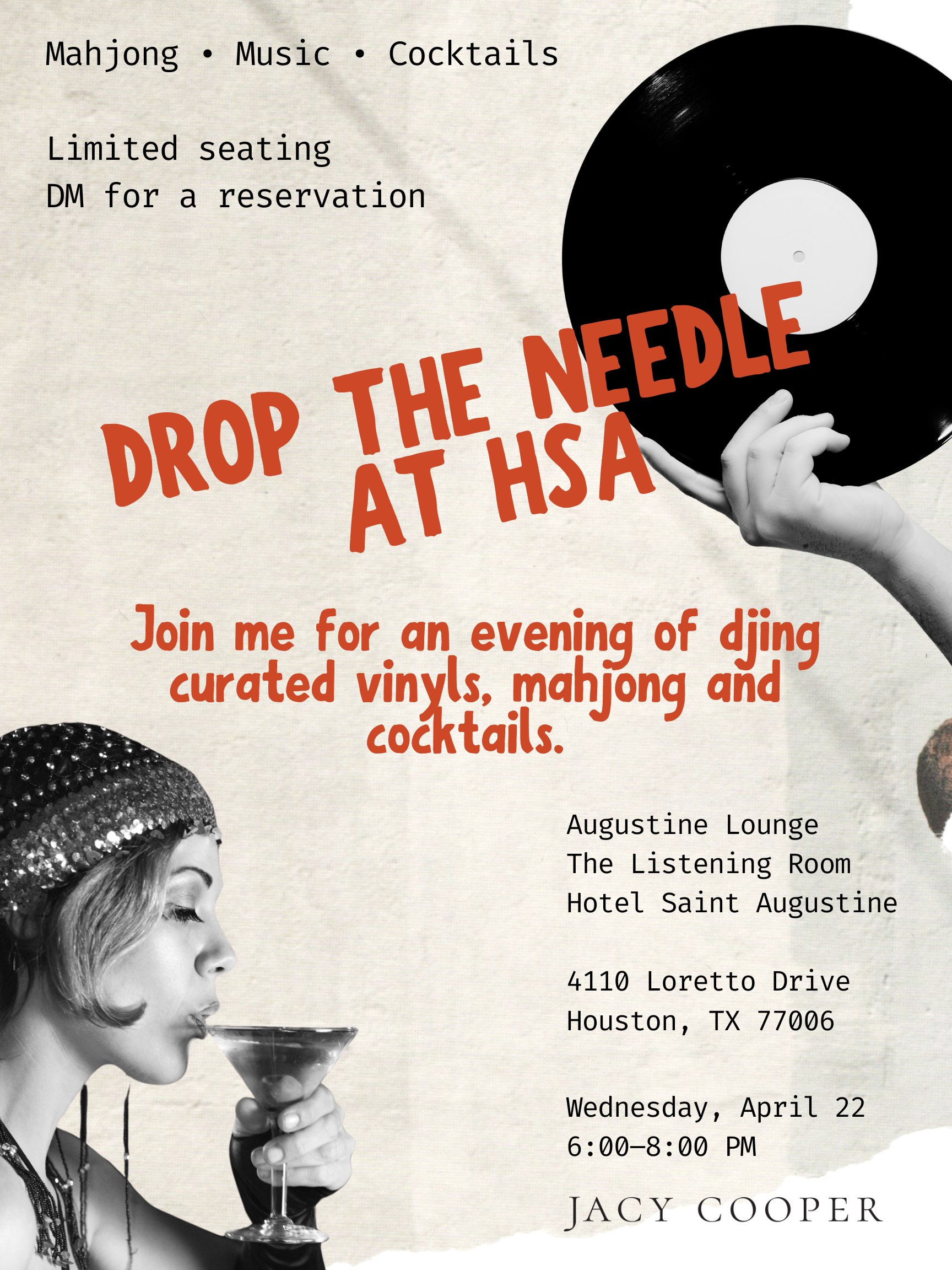 Store › Drop The Needle At HSA Image 1 of 1 Drop The Needle At HSA $50.00 Join me for an evening of djing curated vinyls and mahjong.Ticket reserves a spot to play drinks and food are not included. Add To Cart Added! Join me for an evening of djing curated vinyls and mahjong.Ticket reserves a spot to play drinks and food are not included.